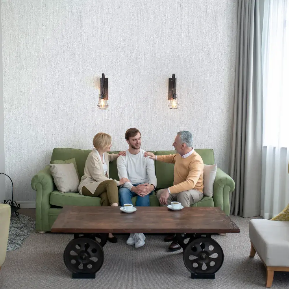 کاغذ دیواری نقره‌ای با بافت برجسته، حس آرامش و تمرکز بیشتری به محیط کار خانگی می‌دهد و هماهنگی خوبی با مبلمان و اکسسوری‌های مدرن دارد.